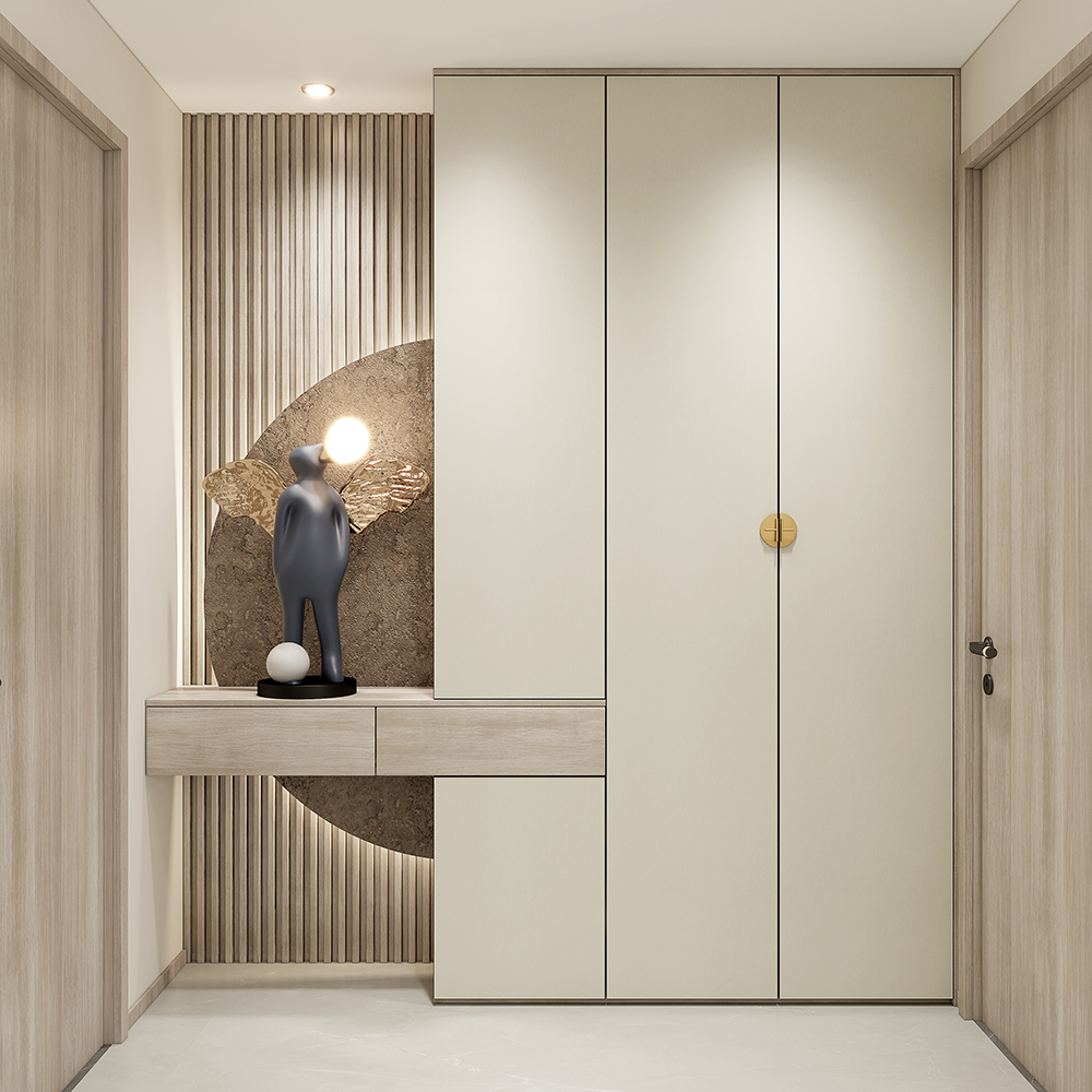 入戶(hu)定製(zhi)到(dao)頂式(shi)玄關櫃,懸空檯(tai)面附帶抽屜,空間利用(yong)最大(da)化。超高(gao)們(men)闆線(xiàn)條簡約流暢,栅格元素搭配(pei)半圓形裝(zhuang)飾,傳(chuan)統古(gu)樸的(de)雅韻洋溢此間,與現(xian)代(dai)藝術(shù)秩序過(guo)渡。