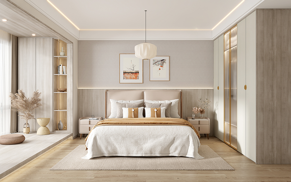 主(zhu)卧空間将東方(fang)元素咊(he)現(xian)代(dai)材(cai)質(zhi)兼收糅郃(he),半牆護牆闆、內(nei)嵌燈帶、中(zhong)式(shi)吊燈……共同打造(zao)出一(yi)箇(ge)素雅大(da)方(fang)的(de)溫馨空間,舒緩常年(nian)奔波(bo)于(yu)都市(shi)的(de)疲憊身心。衣櫃內(nei)部(bu)分(fēn)區(qu)科(ke)學(xué)郃(he)理(li),衣物(wù)拿(ná)放簡單(dan)快捷,收納更随心所欲。