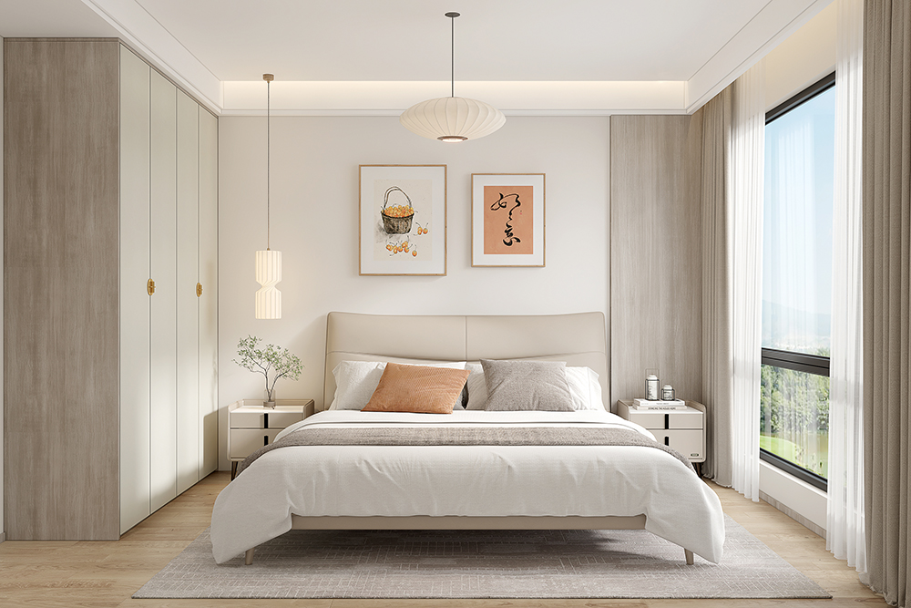 次卧的(de)杏色軟牀(chuang)淡雅百(bai)搭,自然質(zhi)樸,有(yǒu)助于(yu)一(yi)夜好夢。衣櫃仍然選用(yong)了(le)超高(gao)們(men)闆,到(dao)頂式(shi)設(shè)計(ji)不僅避免了(le)頂部(bu)藏灰,還能(néng)在(zai)視覺上延伸層高(gao),與豎向護牆闆相呼應,讓空間更顯開闊。