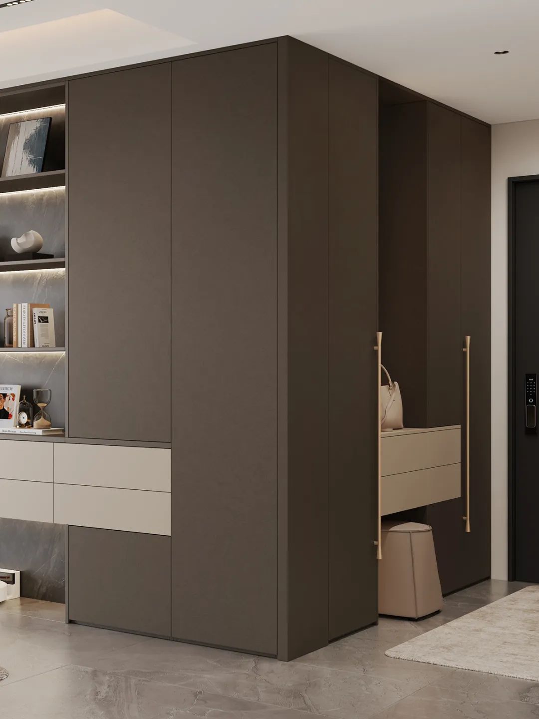 ①H型玄關櫃設(shè)計(ji),穿插開放式(shi)置物(wù)檯(tai),線(xiàn)條簡潔造(zao)型大(da)氣(qi),實用(yong)美觀
