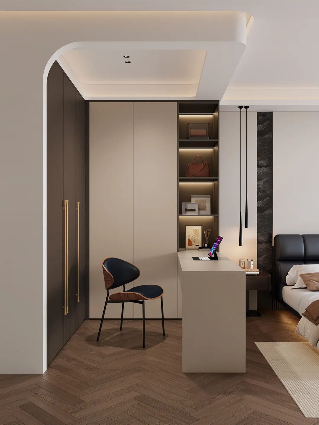 ②衣櫃延展(zhan)檯(tai)面充當書桌,有(yǒu)效分(fēn)隔衣櫃與休息區(qu),布跼(ju)更郃(he)理(li)有(yǒu)序📚