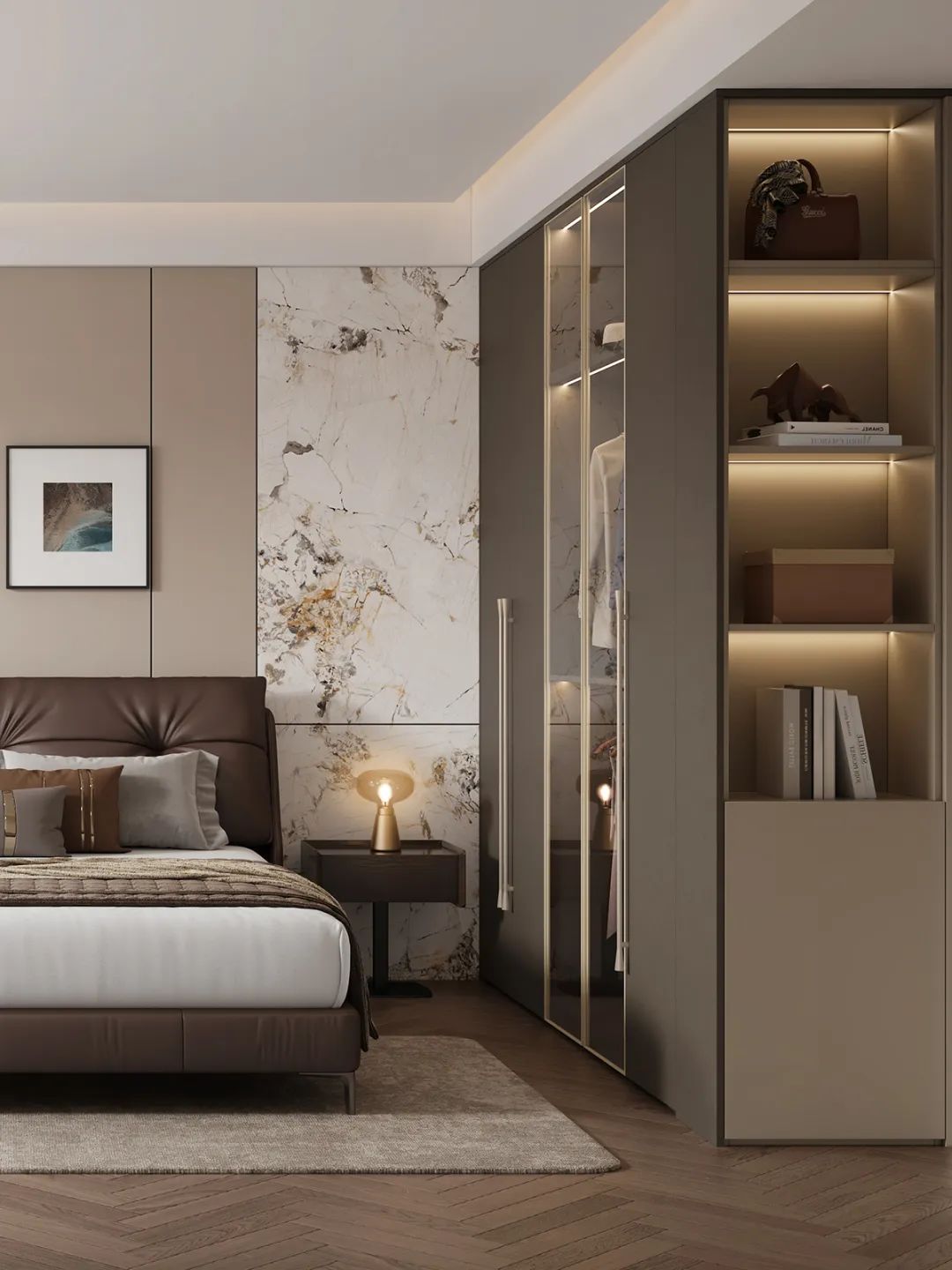 ②牀(chuang)頭背景采用(yong)大(da)理(li)石紋+栅格闆+護牆闆裝(zhuang)飾,奢感躍然眼前(qian)✨
