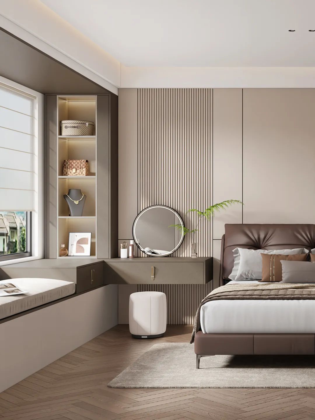 ①飄窗上方(fang)內(nei)嵌開放格,懸空檯(tai)面一(yi)體(ti)打造(zao)梳妝檯(tai)💄提升空間利用(yong)率