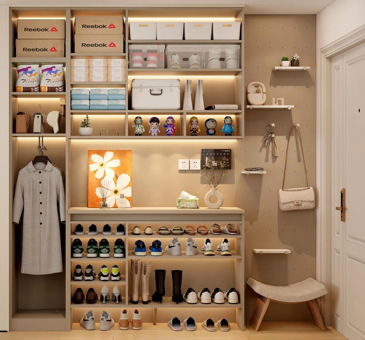 換鞋不用(yong)再蹲着或彎腰🧘‍♀️,上方(fang)還可(kě)以(yi)安(an)裝(zhuang)洞洞闆,挂日(ri)常通(tong)勤的(de)衣服包包,井然有(yǒu)序
