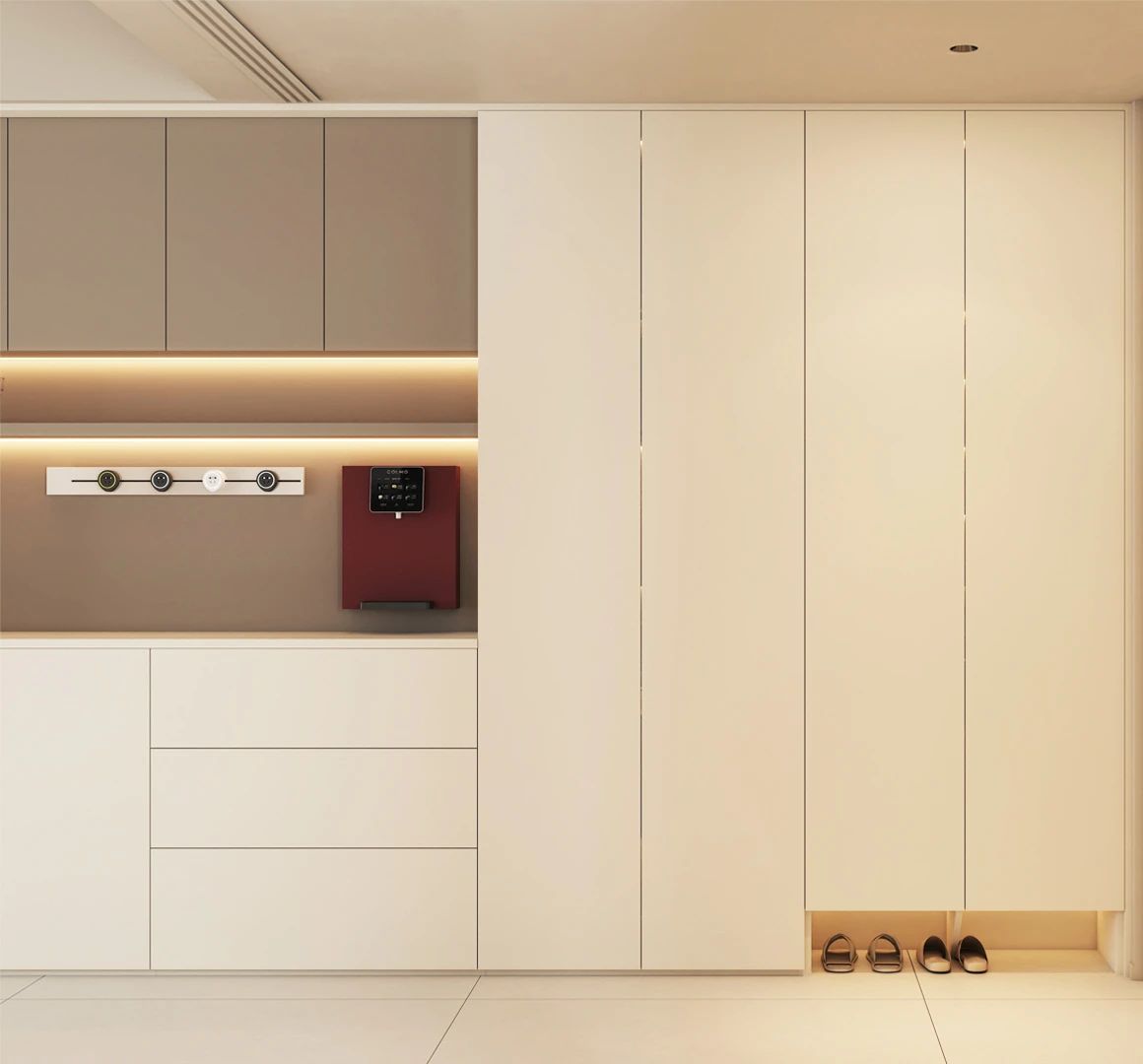 鞋櫃內(nei)部(bu)分(fēn)區(qu)收納,中(zhong)間留空+抽屜,随手放置收納,內(nei)嵌氛圍燈帶 ✨提升儀式(shi)感~